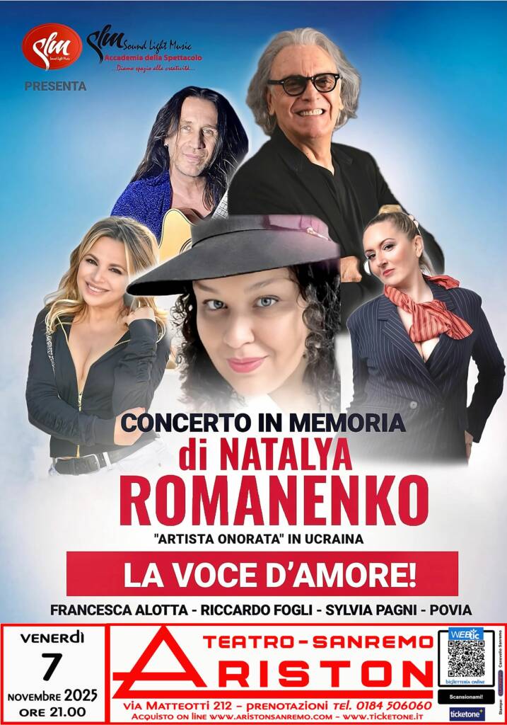 Il sogno di Natalia Romanenko, Artista Onorata dell’Ucraina, era quello di esibirsi sul palco del leggendario teatro Ariston. Purtroppo, se n’è andata troppo presto. In sua memoria e in ricordo del suo sogno, i suoi familiari, amici e colleghi si riuniranno nella sala. Al concerto parteciperanno Riccardo Fogli, Silvia Pagni, Francesca Allotta e Povia e altri artisti che sono già saliti più volte sul palco dell’Ariston per regalare musica e luce al pubblico.