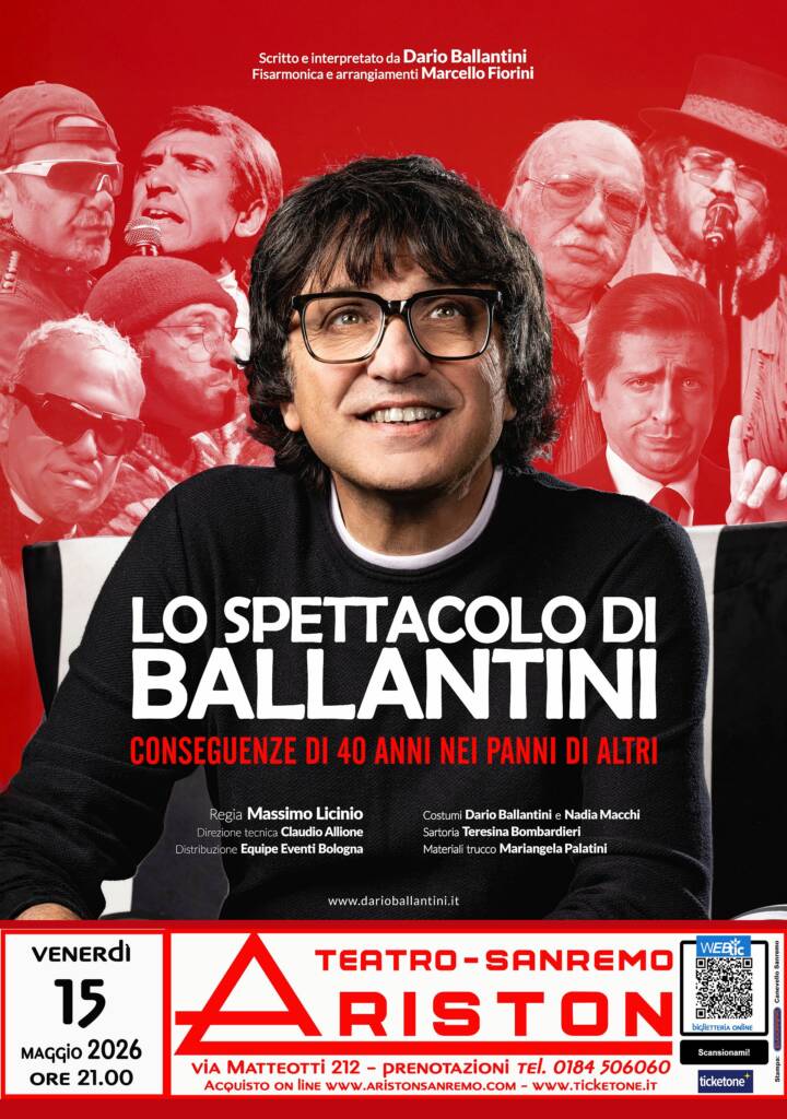 Trama: Ballantini porta in teatro una scelta di trasformazioni doc dei suoi quaranta anni di attività. Dieci cavalli di battaglia interpretati dal suo sorprendente trasformismo, soprattutto quelli legati ad episodi curiosi che in tv non si sono visti e quelli maggiormente legati al mondo della musica. Per ognuno c’è il racconto dei retroscena, degli incontri faccia a faccia imitatore-imitato, con relative conseguenze tragicomiche di una carriera sia televisiva (Striscia La Notizia) che teatrale, totalmente vissuta nei panni di altri. Accompagnato dalla superba fisarmonica di Marcello Fiorini (suo partner anche in Ballantini&Petrolini) e materiali video, Dario farà sfilare come in un concerto a più̀ ospiti, personaggi del calibro di Gino Paoli, Ray Charles, Vasco Rossi, Paolo Conte, Zucchero ed altri, nonché́ l’indimenticabile Valentino, icona comica della sua carriera.