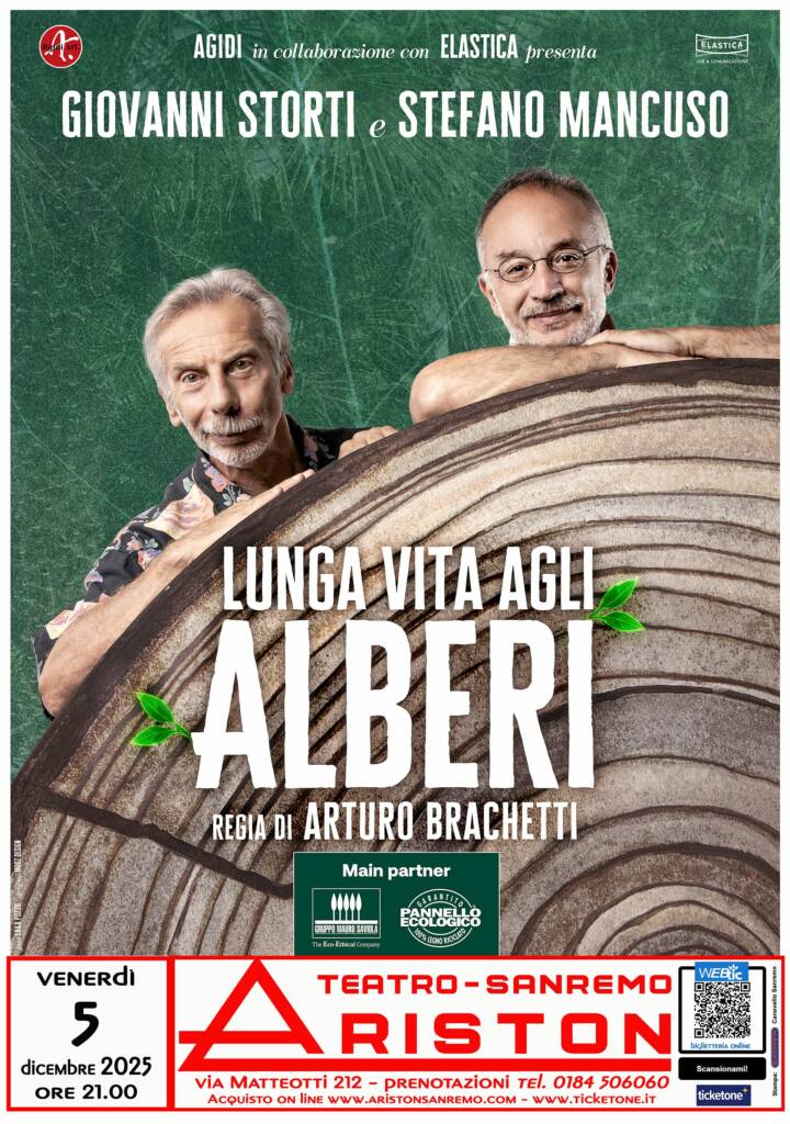 LUNGA VITA AGLI ALBERI è uno spettacolo teatrale che vuole svelare i misteri del mondo vegetale attraverso un viaggio appassionante e sorprendente con una coppia d’eccezione: Giovanni Storti è un curioso viaggiatore accompagnato dal Professor Stefano Mancuso, la sua guida sapiente e illuminata. Il loro viaggio è raccontato dalla regia visionaria e poetica di Arturo Brachetti, che trasforma la narrazione in magia, coinvolgendo il pubblico in una atmosfera di grande suggestione. Questo spettacolo è un ideale viaggio in tre tappe tra natura, comicità e conoscenza, alla scoperta delle tre parti fondamentali di una pianta: radici, fusto e chioma. Racconta la loro importanza e il loro impatto sulla vita dell’uomo e sull’ecosistema. Si inizia con le radici, dove le piante lottano nel sottosuolo per risorse e sopravvivenza formando una rete sotterranea, fatta di comunicazione, collaborazione e competizione. Il viaggio prosegue con il fusto, un luogo di resistenza e crescita. Qui si affrontano i temi dell’adattamento delle piante ai cambiamenti climatici e alle avversità. Il fusto diventa il ponte tra terra e cielo, un simbolo di trasformazione che infonde speranza. Infine, si giunge alla chioma verde che celebra la bellezza, l’armonia e il potenziale rivoluzionario delle piante. Lungo il viaggio, Giovanni Storti esplorerà̀ con stupore e ironia questo mondo affascinante mentre Stefano Mancuso ne svelerà̀ i segreti stupefacenti. LUNGA VITA AGLI ALBERI non è solo un’esperienza teatrale: alternando comicità̀ e momenti di riflessione, vuole sensibilizzare il pubblico sulla cruciale importanza del mondo vegetale per la vita sulla Terra, dimostrando come arte e scienza possano dialogare per generare consapevolezza e ispirare il cambiamento.