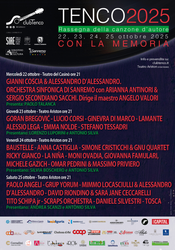 Si avvicina il Premio Tenco 2025, le cui tre serate al Teatro Ariston di Sanremo(Imperia) si terranno il 2324 e 25 ottobre. La rassegna dedicata alla Canzone d’Autore più prestigiosa e rinomata del nostro Paese, manifestazione unica in Europa e al mondo e occasione di incontro e confronto fra artisti e operatori del settore musicale, si tiene dal 1974 nella città del ponente ligure.