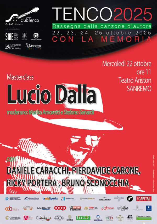 Come di consueto la rassegna si aprirà, mercoledì 22 ottobre, con la masterclass per le scuole, quest’anno dedicata a LUCIO DALLA, che vedrà la partecipazione di Daniele Caracchi (Amministratore Delegato Pressing per la Fondazione Lucio Dalla) e Bruno Sconocchia (storico manager di Lucio Dalla e Presidente AssoConcerti), insieme agli artisti Pierdavide Carone e Ricky Portera. Moderano l’incontro Marika Amoretti (Club Tenco – Coordinamento Scuole) e Stefano Senardi (Presidente Onorario del Club Tenco e Responsabile Rapporti Media Partner).