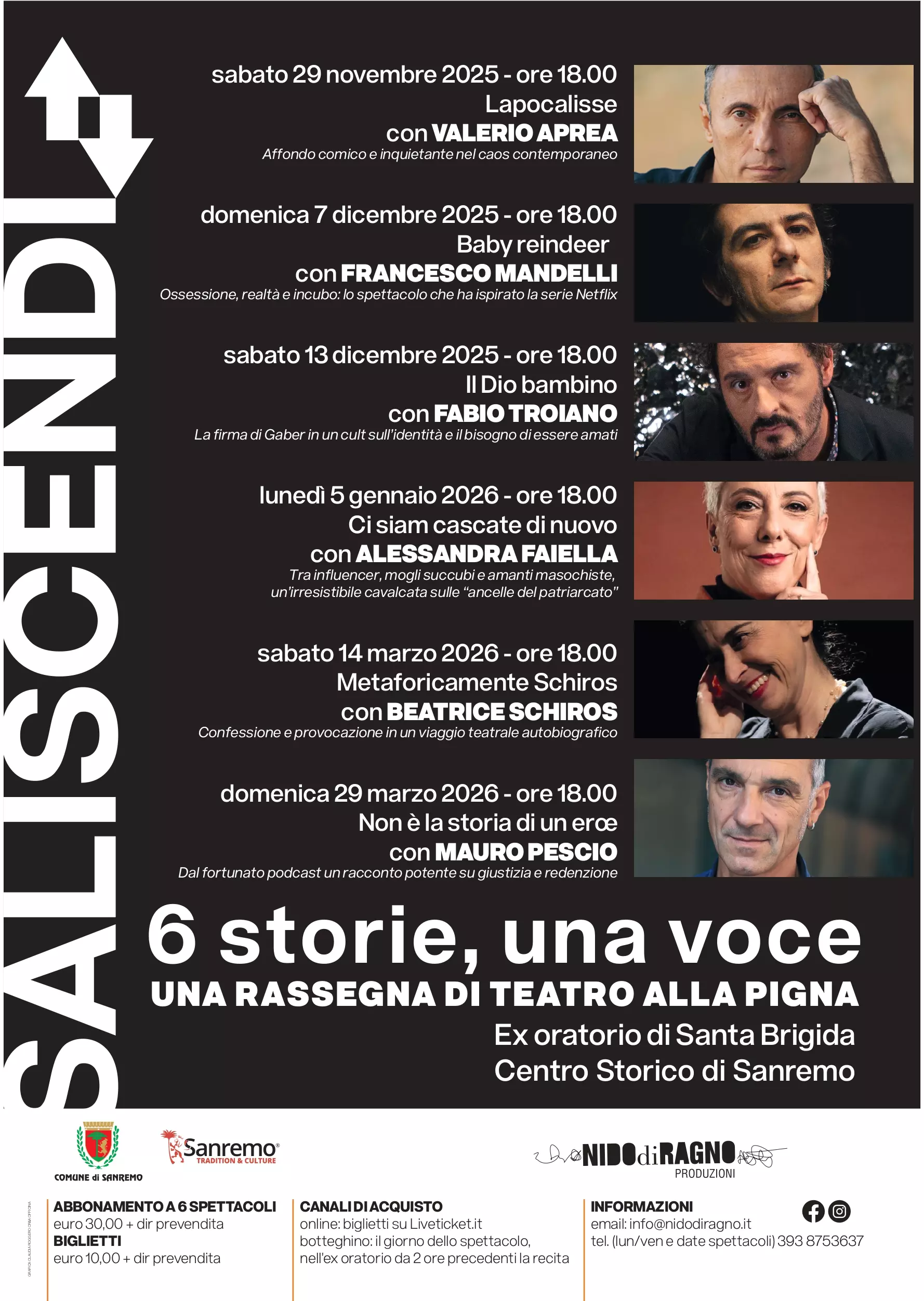 Il teatro arriva nella Pigna, il centro storico di Sanremo. E vi giunge con una rassegna composita di sei spettacoli, sotto le insegne di “Saliscendi”, che ricoprono un arco di quattro mesi esatti, dal 29 novembre 2025 al 29 marzo 2026.