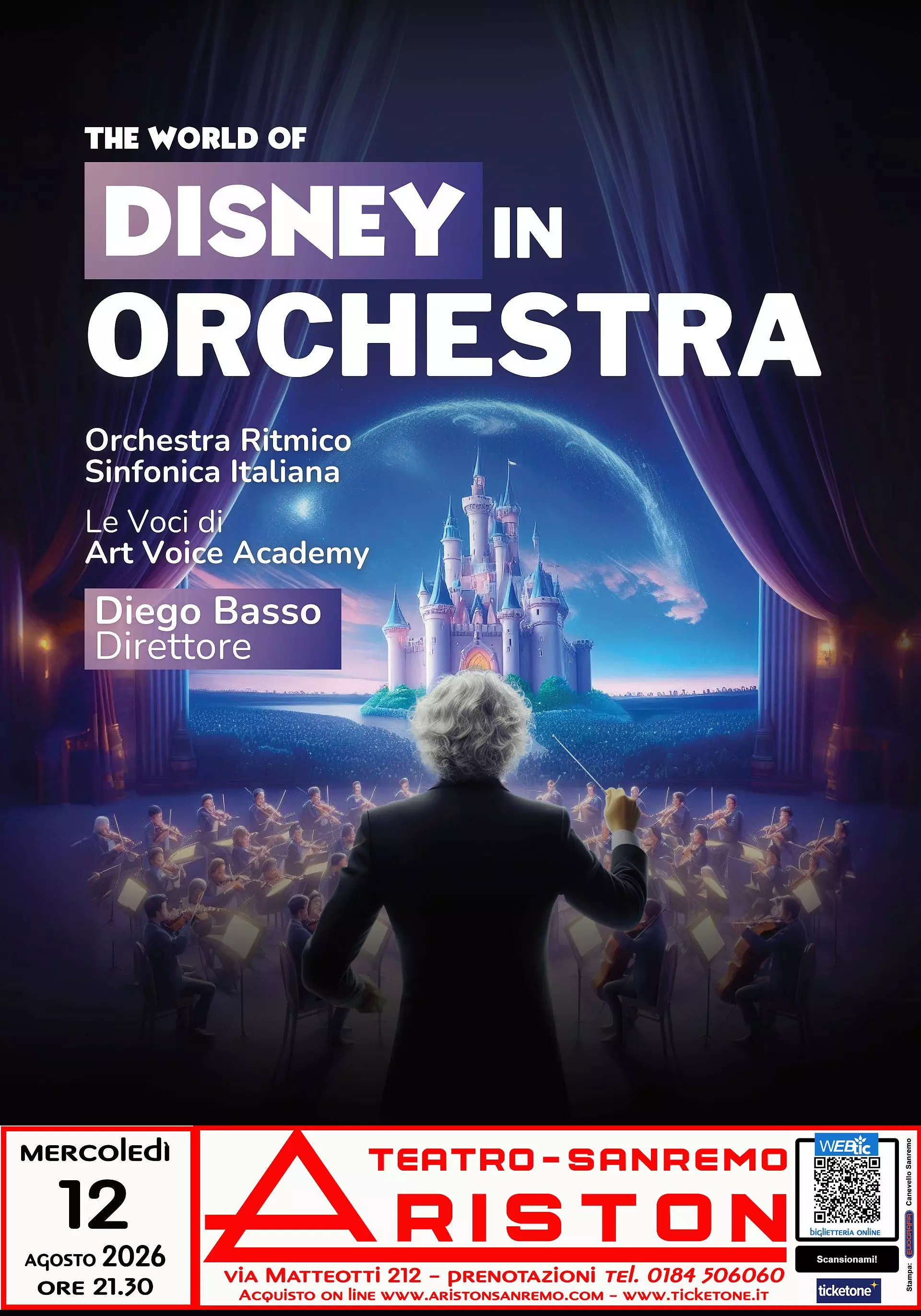 Trama: “The World of Disney in Orchestra”, un progetto straordinario che celebra la magia della musica Disney. Oltre 100 elementi sul palcoscenico tra le voci di Art Voice Academy e i musicisti dell’Orchestra Ritmico Sinfonica Italiana. Questo show, ideato dal Maestro Diego Basso vi regalerà un’esperienza indimenticabile. In questo spettacolo l’Orchestra Ritmico Sinfonica Italiana e le voci di Art Voice Academy, diretti dal Maestro Diego Basso, si uniranno per creare una performance che lascerà il pubblico senza parole. Da generazioni, i film Disney hanno fatto parte delle nostre vite, diventando un’immancabile tradizione natalizia. Dai primi successi come “Biancaneve” nel 1937, passando per “Il Libro della Giungla” nel 1967, “La Bella e la Bestia” nel 1991, il “Re leone” nel 1994, “Tarzan” nel 1999 fino alle produzioni più recenti come “Frozen” nel 2013, i film Disney hanno incantato il pubblico di tutto il mondo. Durante il concerto, ascolterete i temi principali di questi capolavori, da “I Sogni Son Desideri” a “Crudelia De Man”, da “Il Cerchio della Vita” a “Hakuna Matata”, da “In Fondo al Mar” a “I Colori del Vento” e molti altri. “Disney in Orchestra” è molto più di un semplice concerto: è un’esperienza emozionale che coinvolge il pubblico di tutte le età.